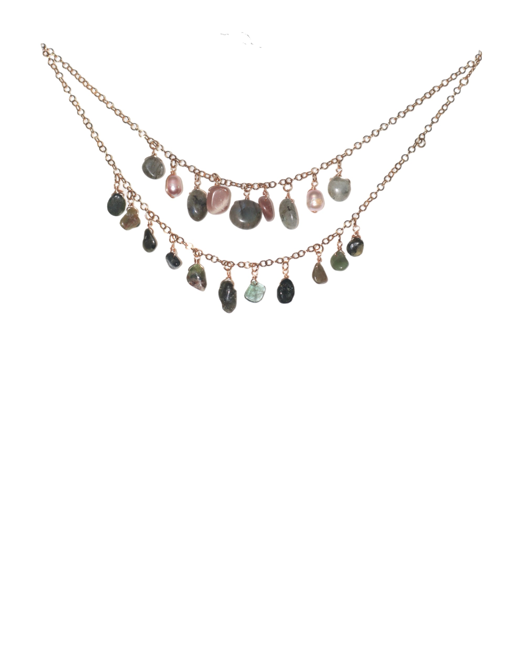Collar en piedras naturales: Labradorita, piedra luna rosada y amazonita verde. Perlas naturales rosadas y cadena bañada en oro de 18k.